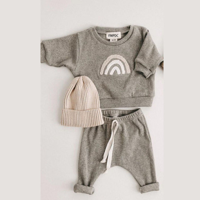 2 pc Set: Baby Toddler Neutral Grey Rainbow Soft Knitted Set