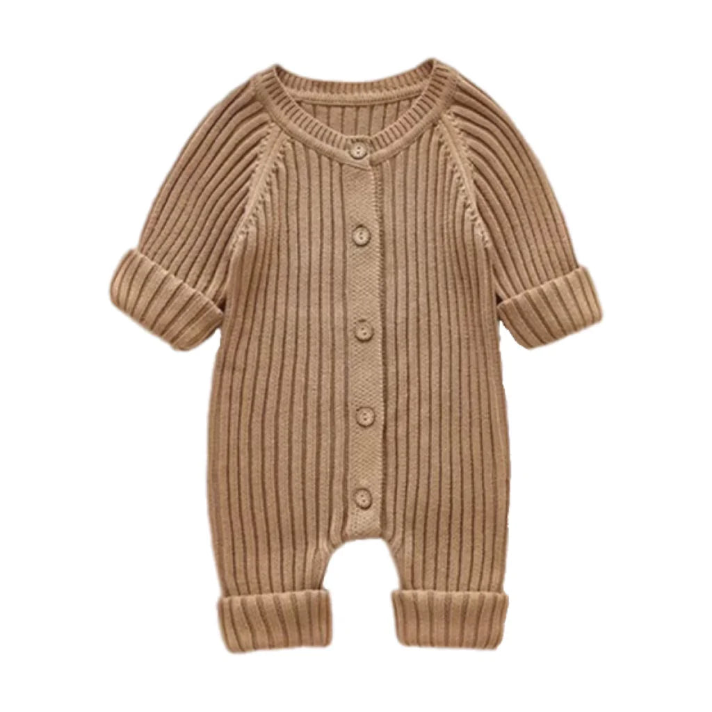 Unisex Infant Toddler Tan Solid Knit Long Sleeve One Piece Button Romper